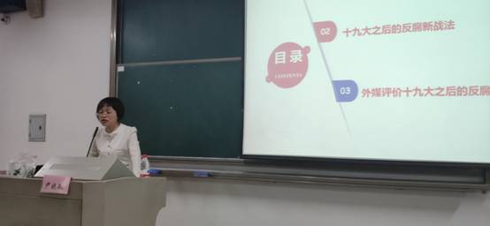 尹晓敏老师以十九大召开后反腐所取得的新成就开篇,向同学们讲述了党对对违纪违法行为的坚决从严查处,“老虎”露头就要打,“苍蝇”乱飞也要拍。反腐败斗争将进一步向基层延伸拓展,形成全覆盖的声势,以实际行动不断增强群众的获得感、幸福感、安全感。